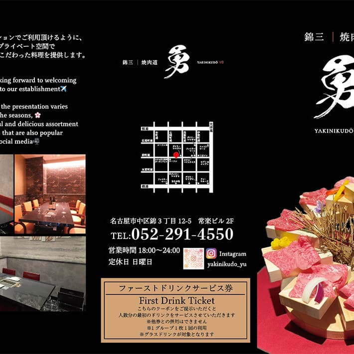 | Price(一例です、区分や業種で異なります) | ロゴデザイン ¥30,000(区分:個人店) ショップカード ¥15,000(区分:カードサイズ両面) ちらし、フライヤー ¥25,000(区分:A4片面) 名刺デザイン ¥8,000(区分:飲食店両面) webデザイン ¥150,000〜(区分:3コンテンツ程度、レスポンシブ) オンラインショップ ¥300,000〜 専属委託デザイン販促部 ¥100,000〜/月額 |